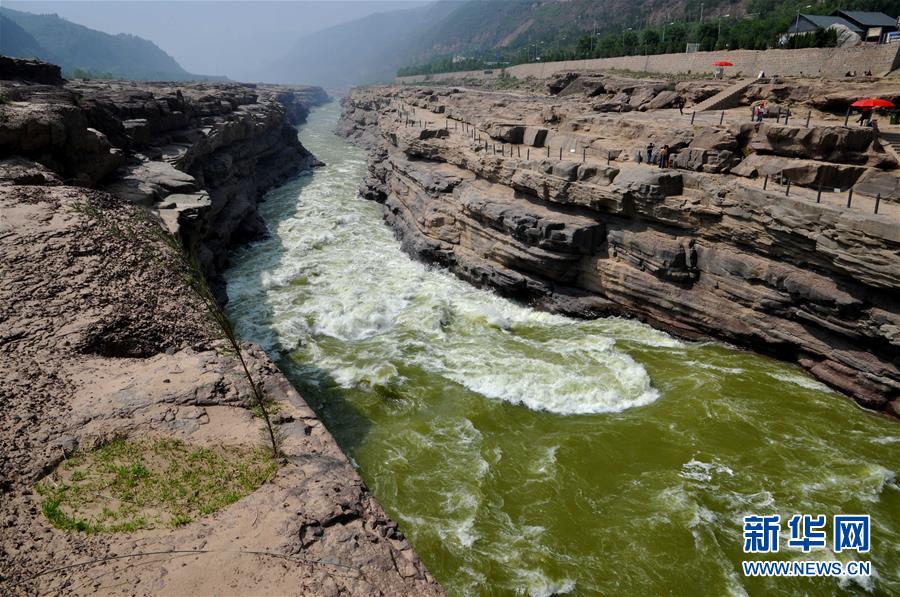 5月10日,游客在黃河壺口瀑布景區(qū)游覽。自4月下旬以來,受上游降雨偏少和黃河干流來水量減少影響,河水流速變緩,泥沙沉淀,位于山西吉縣和陜西宜川縣交界的壺口瀑布水色明顯變清,呈現(xiàn)出別于日常的“清流飛瀑”景觀。新華社發(fā)(呂桂明 攝)
