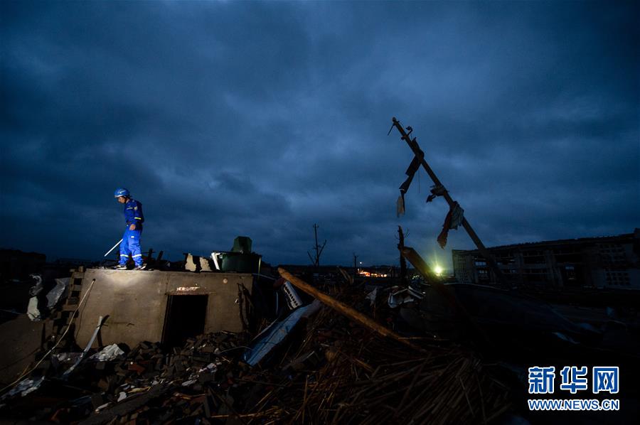 6月24日黎明,搜救人員在鹽城市阜寧經(jīng)濟(jì)開發(fā)區(qū)北陳村進(jìn)行排查搜救。新華社記者李響攝