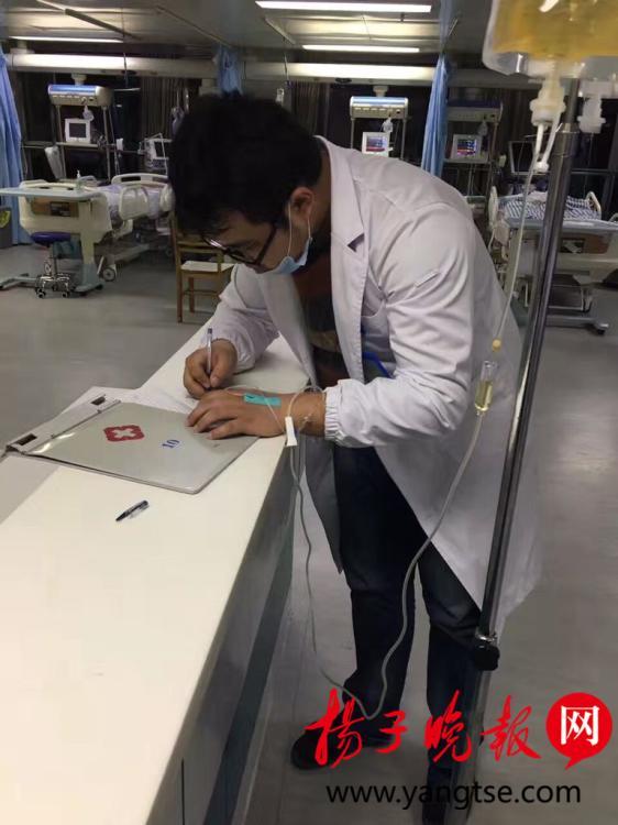 10月29日,一位身穿白大褂帶著口罩的男醫(yī)生,一邊打點(diǎn)滴,一邊為病人下醫(yī)囑的照片,出現(xiàn)在記者的微信朋友圈中。記者獲悉,這位醫(yī)生是江蘇鹽城市濱海縣人民醫(yī)院的一名醫(yī)師,當(dāng)時(shí)正在搶救病人,現(xiàn)場(chǎng)非常感人。圖片來源:揚(yáng)子晚報(bào)網(wǎng)
