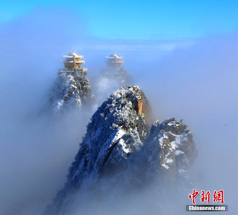 1月7日,連續(xù)降雪之后,位于河南洛陽(yáng)的道教圣地老君山雪后初晴,海拔2000米的伏牛山主峰上,白雪皚皚、銀裝素裹,加之云海浮現(xiàn)與藍(lán)天白云交相輝映,絕壁道觀似瓊樓玉宇幻如仙境美不勝收。王中舉 攝
