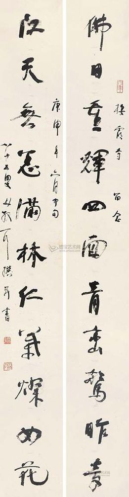 北京匡時國際拍賣有限公司描述稱,林散之先生的這副作品作于1980年,為棲霞寺所書,林氏時年83歲,已是人書俱老的時期……林散之筆下的線條曲中有直,直中寓曲,剛中有柔,柔中寓剛,從而達到一種清逸虛妙之境。林散之的草書風格雖然欹正相生,但往往會把其中的變化復歸平正,偏能得中,奇而能穩(wěn),故顯得格外的老成與持重。由于林散之的藝術思想受佛家影響較深,而此為“三論宗”的發(fā)源地棲霞寺所書,更能見其書寫之虔誠。