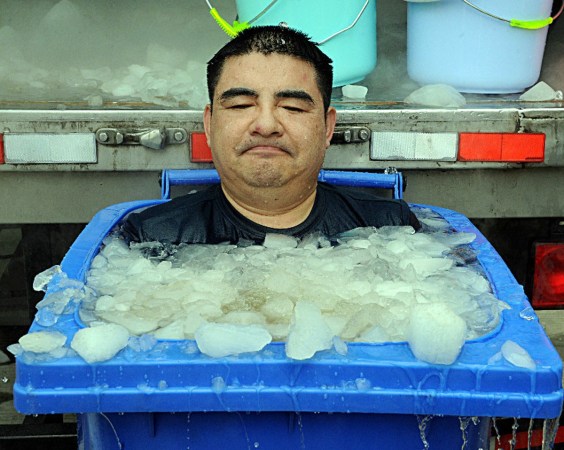 2014年8月22日,陳光標發(fā)微博稱“陳光標坐垃圾桶挑戰(zhàn)冰桶記錄”,圖為陳光標坐在充滿冰水的垃圾桶內(nèi)被潑冰水。