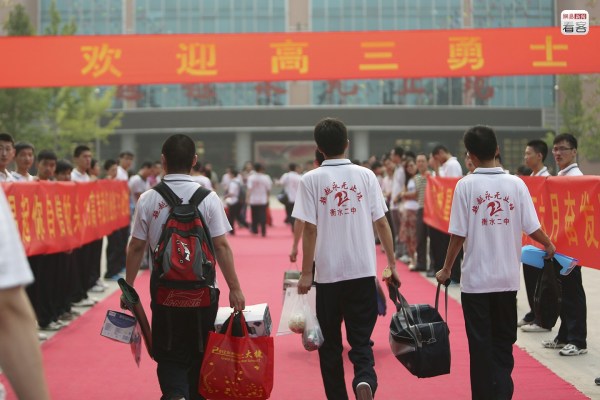 圖為2013年5月24日,衡水二中高三學生經(jīng)過短暫的休息返校,這次返校后他們下一次休息將是高考結束。歸校時,他們被譽為“勇士”,所有高三班主任則站在門口兩側迎接學生歸來。