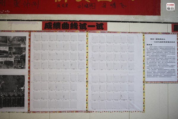 圖為2013年5月10日,學校走廊上貼著的“成績曲線”,將每個學生歷次考試成績以曲線的方式展現(xiàn)。而這樣類似的成績表、成績單布滿了走廊的每一面墻。