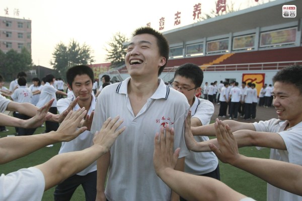 在這種壓力之下,學校也開始想方設法為學生們增加信心,有時候也會倡導“快樂高考”。圖為2012年5月30日,老師們帶領學生參加拓展訓練以疏解壓力。