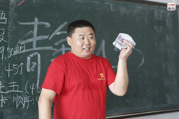 學校的另一項解壓措施是發(fā)放“回頭錢”,向每名學生發(fā)兩張五元紙幣,寓意“五谷豐登”、“十全十美”。圖為2012年6月3日,一位老師拿著一沓新紙幣準備發(fā)給學生。
