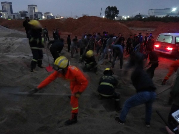 12月27日傍晚5點(diǎn)20分左右,悲劇發(fā)生在翔安馬巷鎮(zhèn)亭洋村亭洋公寓后面工地。圖為消防官兵和附近居民幫忙挖沙救人。