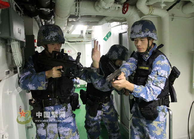 海軍第十一批護(hù)航編隊赴亞丁灣、索馬里海域執(zhí)行護(hù)航任務(wù)以來,針對海況復(fù)雜多變,海盜活動更趨隱蔽、猖獗、頻繁等嚴(yán)峻特點,編隊指揮所科學(xué)籌劃護(hù)航行動,研究掌握海盜活動的特點規(guī)律,合理安排值更執(zhí)勤,加強巡邏警戒,狠抓各項制度落實,搞好預(yù)想預(yù)測,完善多套方案預(yù)案,著力提高快速反應(yīng)能力。在查證、驅(qū)離疑似海盜船只時,確保預(yù)先發(fā)現(xiàn)、快速反應(yīng)、掌握主動,把兩個“百分之百”要求落到實處。圖為3月下旬編隊實施護(hù)航行動時的一組場景。