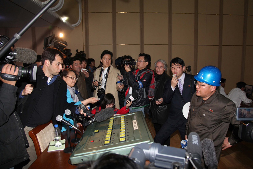2012年4月8日,在朝鮮平安北道鐵山郡東昌里的“西海衛(wèi)星發(fā)射場”監(jiān)控中心,“西海衛(wèi)星發(fā)射場”總負(fù)責(zé)人張明進(jìn)(戴藍(lán)盔者)向記者介紹情況。
