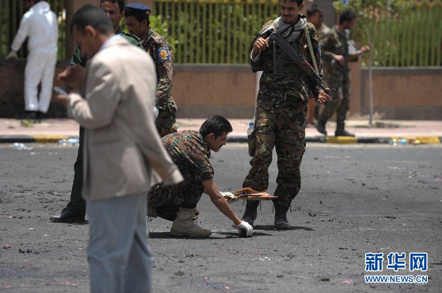 5月21日,在也門首都薩那,也門安全部隊(duì)人員在爆炸現(xiàn)場清理殘骸。