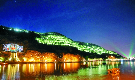 夜色下的龍門在各色燈光的映照下美輪美奐,萬(wàn)千佛陀現(xiàn)金身。記者 陳曉東 攝 啟天 制圖