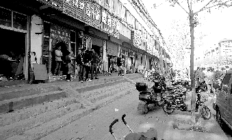 在潁河西路,道路兩側(cè)的機(jī)動車隨意停放,路面污水橫流、垃圾到處都是,路南側(cè)的商戶更是將非機(jī)動車道全部占用。