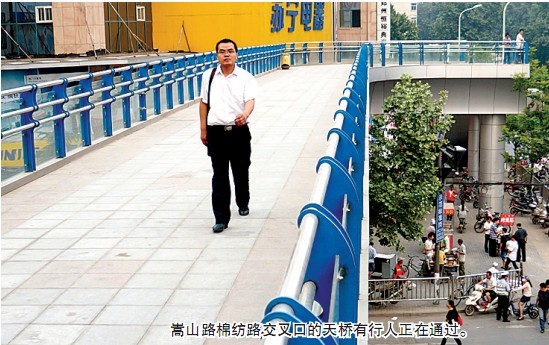 嵩山路棉紡路交叉口的天橋有行人正在通過(guò)。