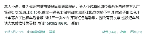前天23時(shí)25分,一位微博名叫“勤行者有志”的網(wǎng)友發(fā)布了一條微博,稱自己是“小朱”,曾為鄭州市城市管理局微博管理員,妻姐把一輛藍(lán)色的嬰兒推車落在了出租車后備廂,希望大家?guī)兔ふ摇?/p>