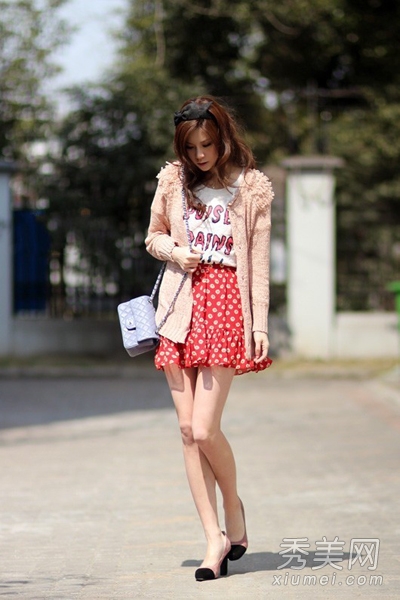 淺粉色立體花針織開衫,很清甜可愛的風格,穿在身上有種溫婉的氣息,內(nèi)搭白色T恤下穿白色波點紅色短裙,拼接高跟鞋,優(yōu)雅魅力十足。