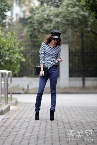 藍色條紋長袖T恤搭配藍色鉛筆褲,喜歡藍色的女生可以學(xué)學(xué)這身搭配,比較簡單但很有氣場。配上蓋帽和同色高跟鞋,挺有歐美風格。