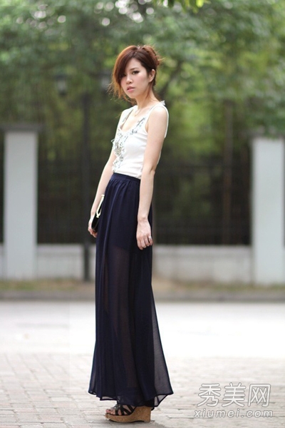 白色背心搭配黑色半身長裙,還是透視感的款式,特別有T臺的感覺。簡約的黑白配清新淡雅,散發(fā)著一種低調(diào)的時尚感。