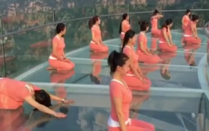 • 實拍百人懸空玻璃觀景臺上練瑜伽