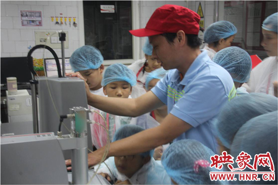 穿上白色的參觀服、戴上一次性帽子,受邀家庭進(jìn)入了檢測(cè)區(qū),參觀了質(zhì)量控制的檢測(cè)工作流程。正在工作的品控員,現(xiàn)場(chǎng)邀請(qǐng)了一名小朋友進(jìn)行了其中一項(xiàng)檢測(cè)--白利度檢測(cè)?!昂?jiǎn)單來(lái)講,就是利用密度儀,測(cè)試一瓶飲料的糖度和含氣量?jī)蓚€(gè)指標(biāo)。”品控員張青介紹道。