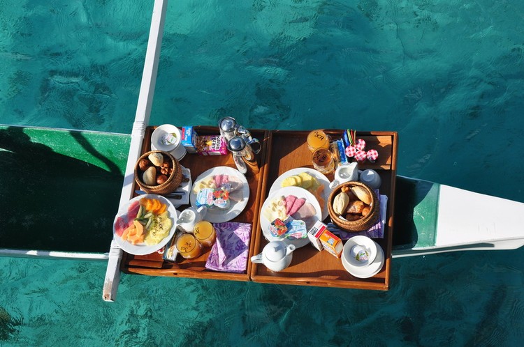 住在島上的水木屋里,睜開眼睛的時(shí)候,會(huì)有一對當(dāng)?shù)氐目∧忻琅?,劃著一艘?dú)木舟,送上濃香的咖啡,配上吐司和各色水果。當(dāng)然這頓早餐價(jià)格不菲哦!