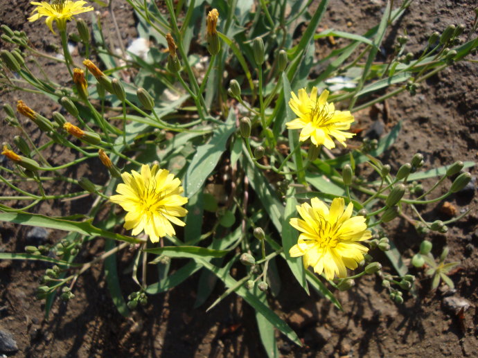 原生形態(tài):抱莖苦荬菜多年生草本,高可達(dá)1米許。根粗壯而垂直。莖直立。根生葉排成蓮座狀,葉片長(zhǎng)圓狀倒披針形,倒向羽裂狀或羽狀缺刻,先端短尖或鈍圓,基部慚狹成柄,花期通常不萎落;莖生葉基部抱莖。頭狀花序排成傘房狀;總苞圓摘狀,外層苞片極短小,內(nèi)層苞片線狀披針形;花黃色,全部為舌狀花,先端5齒裂;花柱細(xì)長(zhǎng),柱頭2裂,冠毛白色,一層。瘦果紡錘形,稍扁,果喙長(zhǎng)約為瘦果的1/4,通常與瘦果不同色?;ㄆ诖杭尽I谏侥_、路邊、疏林內(nèi)、河邊。