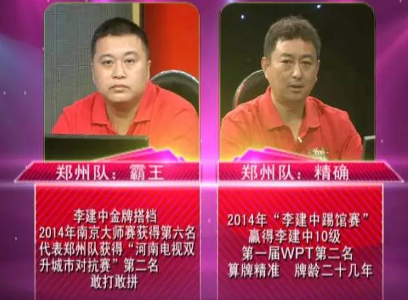 鄭州隊(duì)派出了“霸王”和“精確”?!鞍酝酢痹?015年“李建中踢館賽”期間,與李建中是金牌搭檔;在2014年南京大師賽上獲得第六名;曾代表鄭州隊(duì)獲得“河南電視雙升城市對(duì)抗賽”第二名,經(jīng)?;钴S在雙升銀屏的舞臺(tái)上。