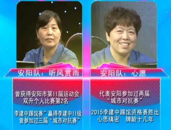 雖然來的是兩名女隊(duì)員,但是人家巾幗不讓須眉?!奥狅L(fēng)賞雨”曾獲得安陽市第11屆運(yùn)動(dòng)會(huì)雙升個(gè)人比賽第2名;2015年“李建中踢館賽”領(lǐng)先李建中11級(jí);參加過三次“河南電視雙升城市對(duì)抗賽”?!靶脑浮痹?015年“李建中踢館資格賽”中勝出;代表安陽隊(duì)參加過兩屆“河南電視雙升城市對(duì)抗賽”,牌齡十幾年。