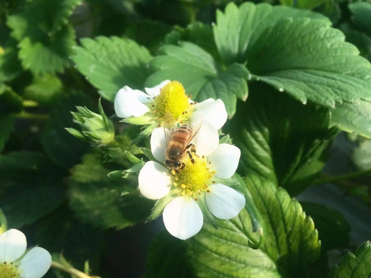 紅顏草莓是由優(yōu)質草莓品種章姬和幸香雜交育成,它繼承了章姬的鮮甜和幸香的耐儲存,也因根基部顏色發(fā)紅得名。一進棚,就聽到陣陣的嗡嗡聲。潔白的草莓花上,小蜜蜂展著透明的翅膀正忙著采蜜。據(jù)說經過蜜蜂授粉良好的花朵才能長出個頭飽滿勻稱的草莓。