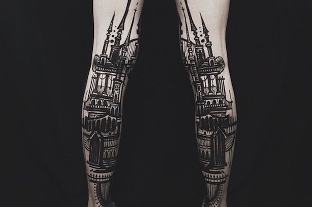 巴頓在人體的手部、胸部和腿部作畫。這套紋身作品,主要以風景和建筑為題材,結合人體藝術,利用人體的對稱感和立體感,打造視覺上的驚艷效果。