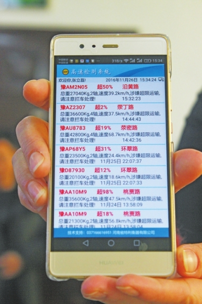 超載信息通過監(jiān)控裝置實時傳輸到值勤交警的手機中。
