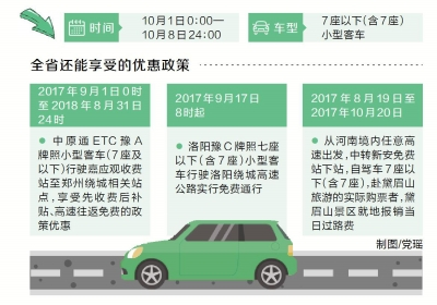 同時(shí),全省還能享受到除高速免費(fèi)以外的其他優(yōu)惠政策:從2017年9月1日0時(shí)至2018年8月31日24時(shí),中原通ETC豫A牌照小型客車(7座及以下)行駛嘉應(yīng)觀收費(fèi)站至鄭州繞城相關(guān)站點(diǎn),享受先收費(fèi)后補(bǔ)貼、高速往返免費(fèi)的政策優(yōu)惠;2017年9月17日8時(shí)起,洛陽(yáng)豫C牌照7座以下(含7座)小型客車行駛洛陽(yáng)繞城高速公路實(shí)行免費(fèi)通行;2017年8月19日至2017年10月20日,從河南境內(nèi)任意高速出發(fā),中轉(zhuǎn)新安縣下站,自駕7座以下(含7座)小型客車赴黛眉山旅游的實(shí)際購(gòu)票者,黛眉山景區(qū)就地報(bào)銷當(dāng)日過路費(fèi)。