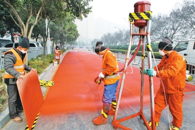 “機動車道6米寬,鋪設(shè)‘綠道’的自行車道也為6米寬。看慣了灰黑色的路面,在看到色彩明銳的‘綠道’后肯定覺得眼前一亮?!G道’只是叫法,并不是說道路外觀一定是綠色的,在景觀設(shè)計中,‘綠道’往往有著更深更廣的內(nèi)涵。”工程負(fù)責(zé)人呂先生告訴記者,彩色瀝青厚度僅為1到2毫米,壽命在5年以上,具有警示、防滑、降噪、美觀等特點?!拔覈G道’通常以警示色紅色為主打,主要作用是打造人車分離模式,供騎車者和步行者休閑使用?!?/p>